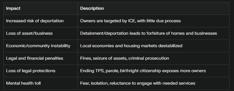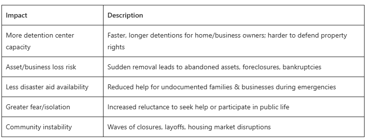 Detained owners are often unable to manage homes or businesses, resulting in abandoned properties, foreclosures, business closure, loss of jobs for employees, and disruption of local economies. The expedited removal processes and ICE’s larger operational capacity (now backed by FEMA funds) further decrease the window for owners to arrange their affairs, sell assets, or transfer responsibilities—raising the chances of abrupt financial ruin. -